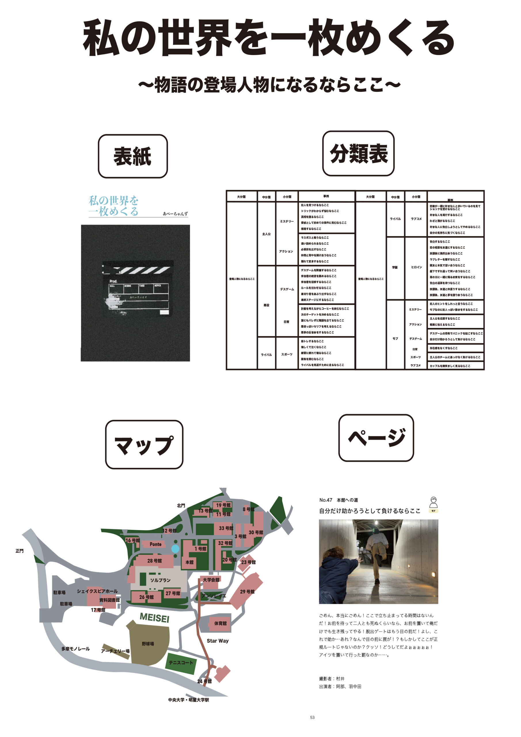 上の画像はこの授業の課題の「◯◯するならここ!明星大学ガイドブック」の企画パネルです。